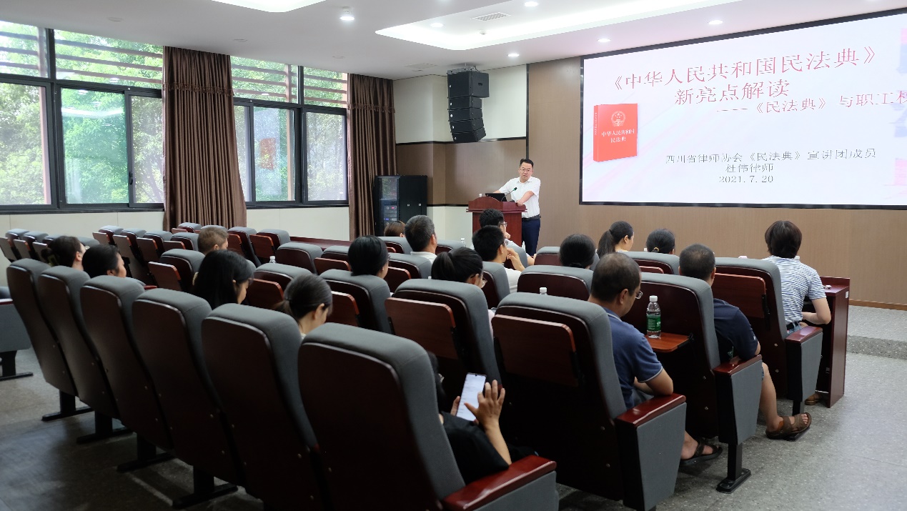 2021年7月20日,黄色网址大全 行政党支部邀请四川省律师协会副监事长杜伟律师开展了主题为“《民法典》与职工权益”的普法讲座,此次活动是黄色网址大全 “行政管理能力提升计划”活动之一。黄色网址大全 行政办、专业实验室约30名老师积极参加了此次讲座。讲座由黄色网址大全 李艳梅副院长主持。