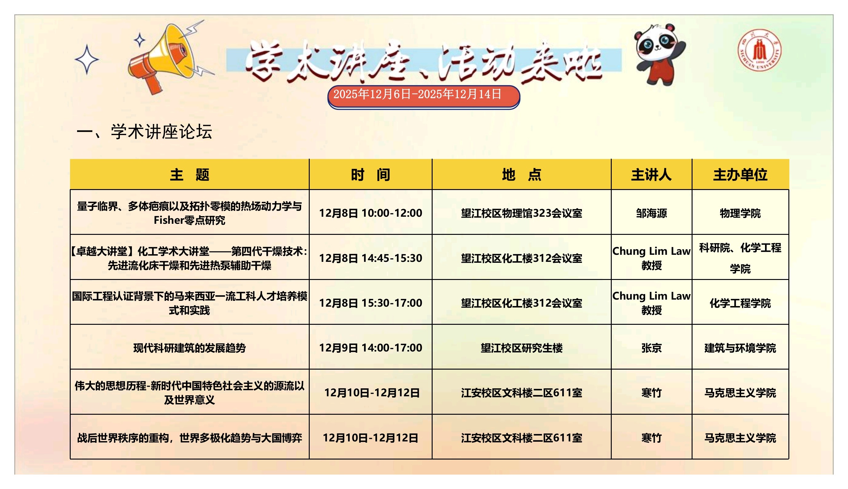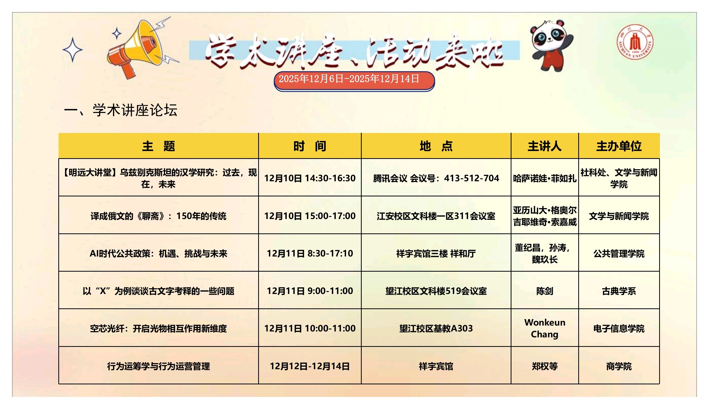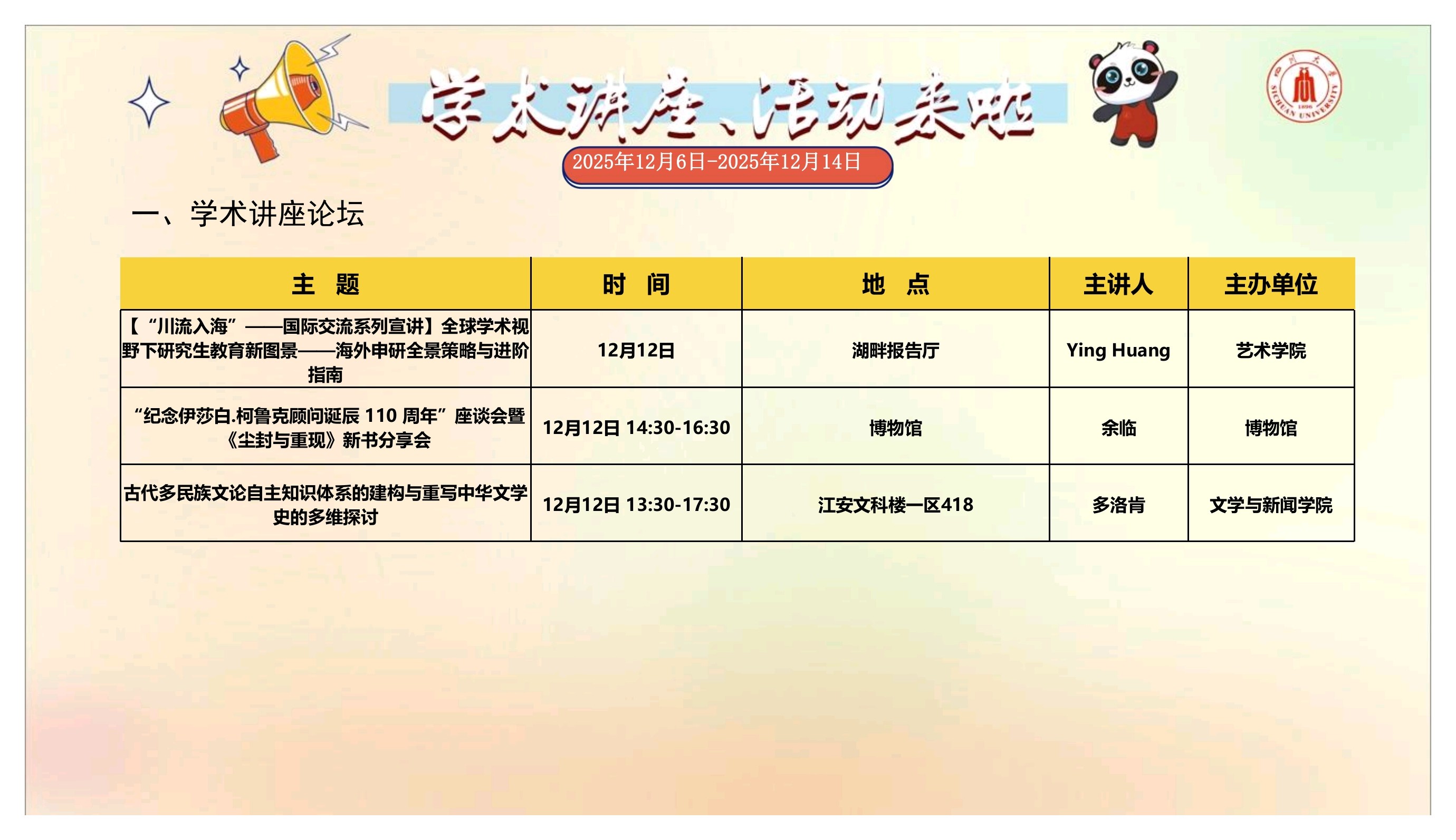 学术讲座和校园文化活动预告(2025年12月6日-2025年12月14日)