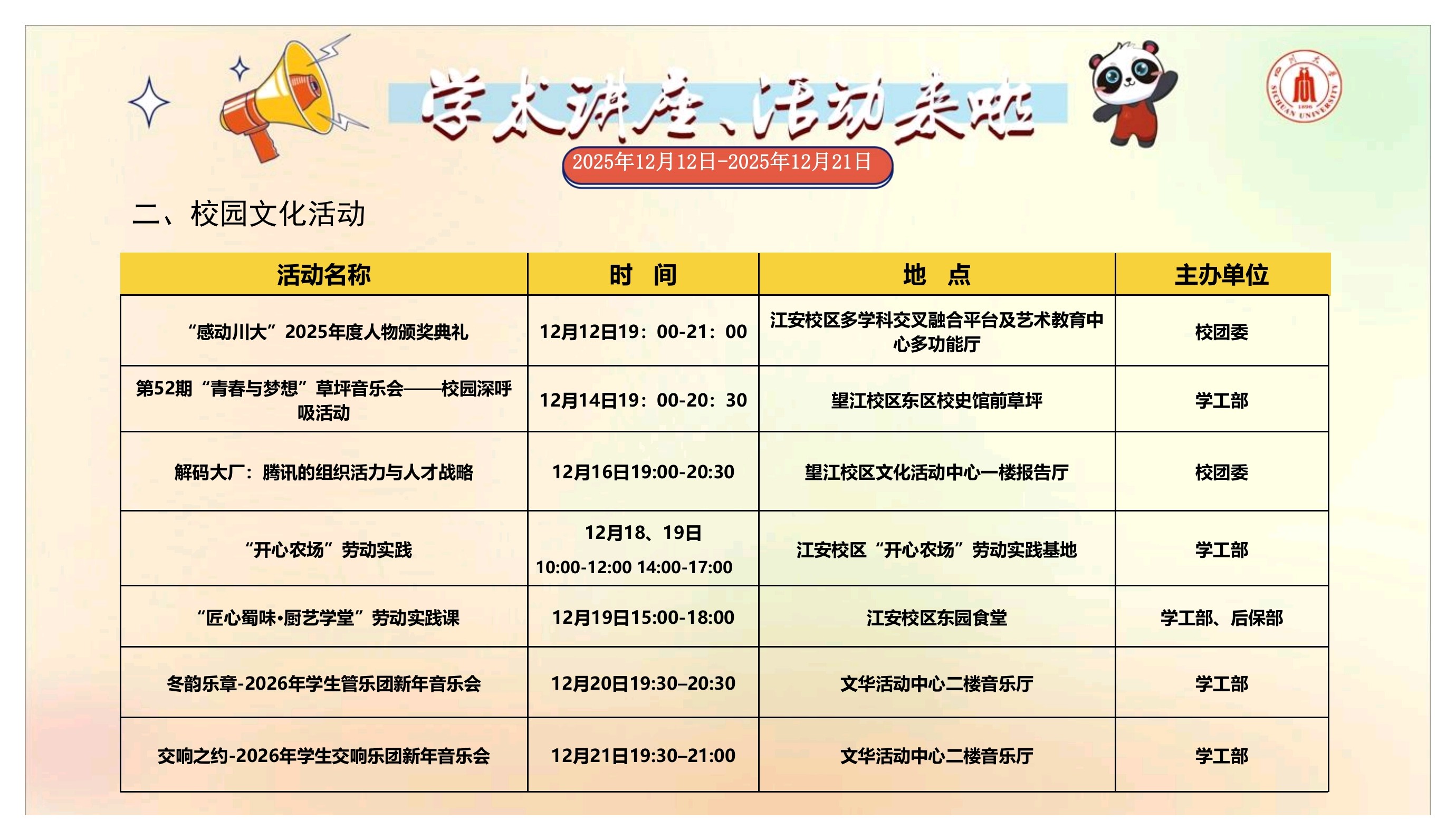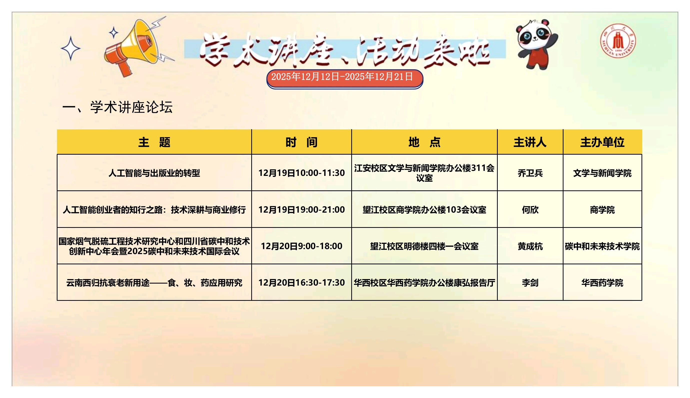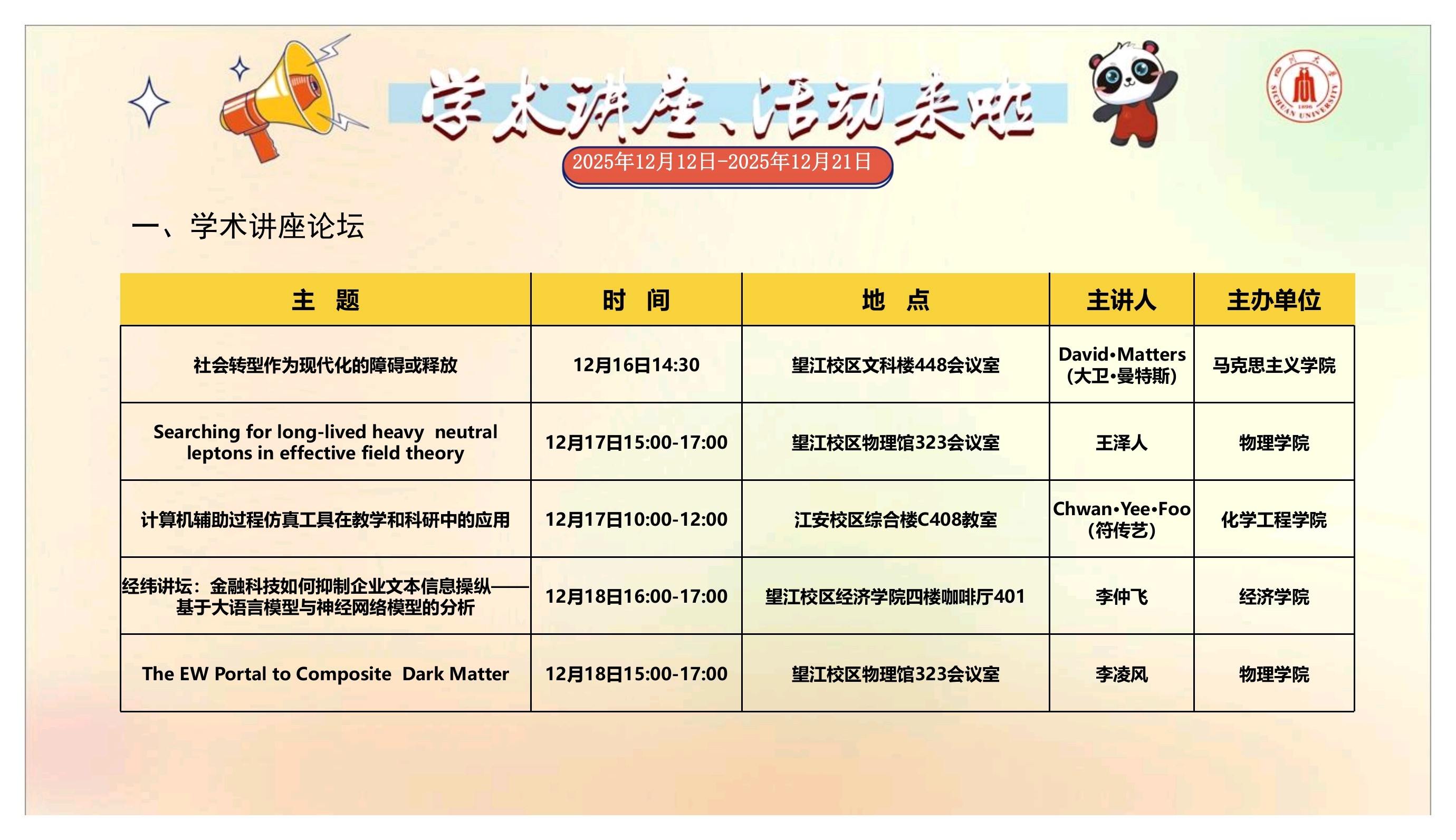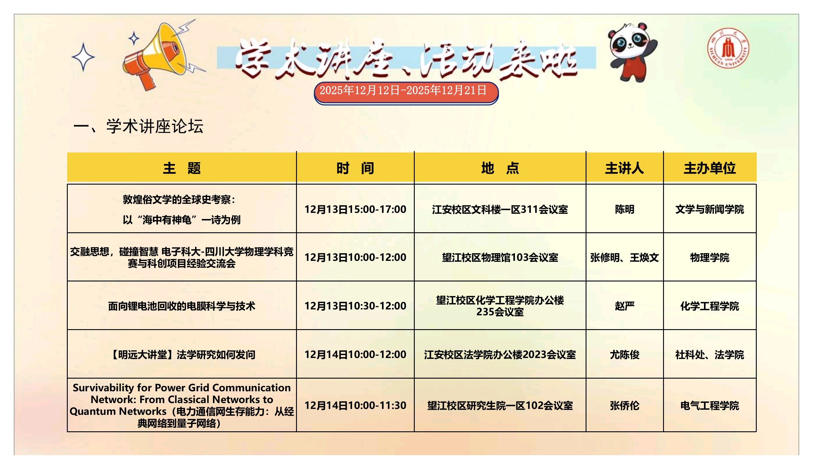学术讲座和校园文化活动预告(2025年12月12日-2025年12月21日)