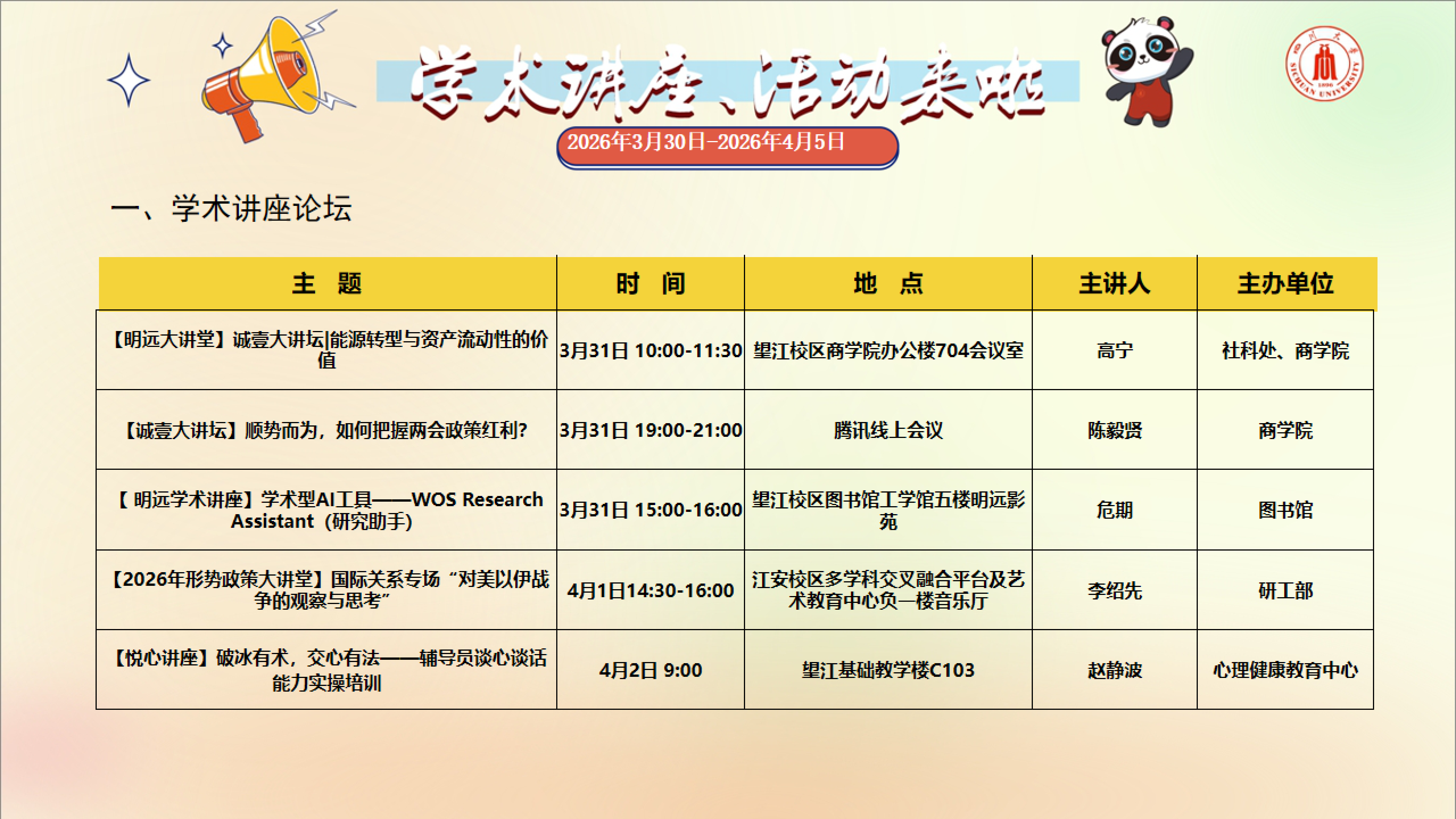 学术讲座与校园文化活动预告(2026年3月30日-2026年4月5日)